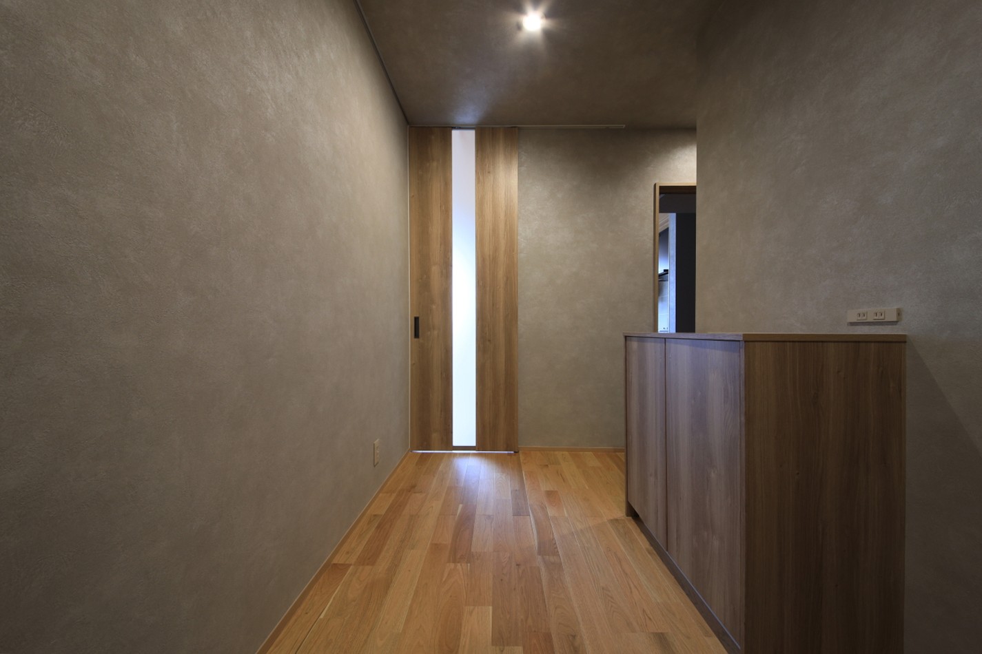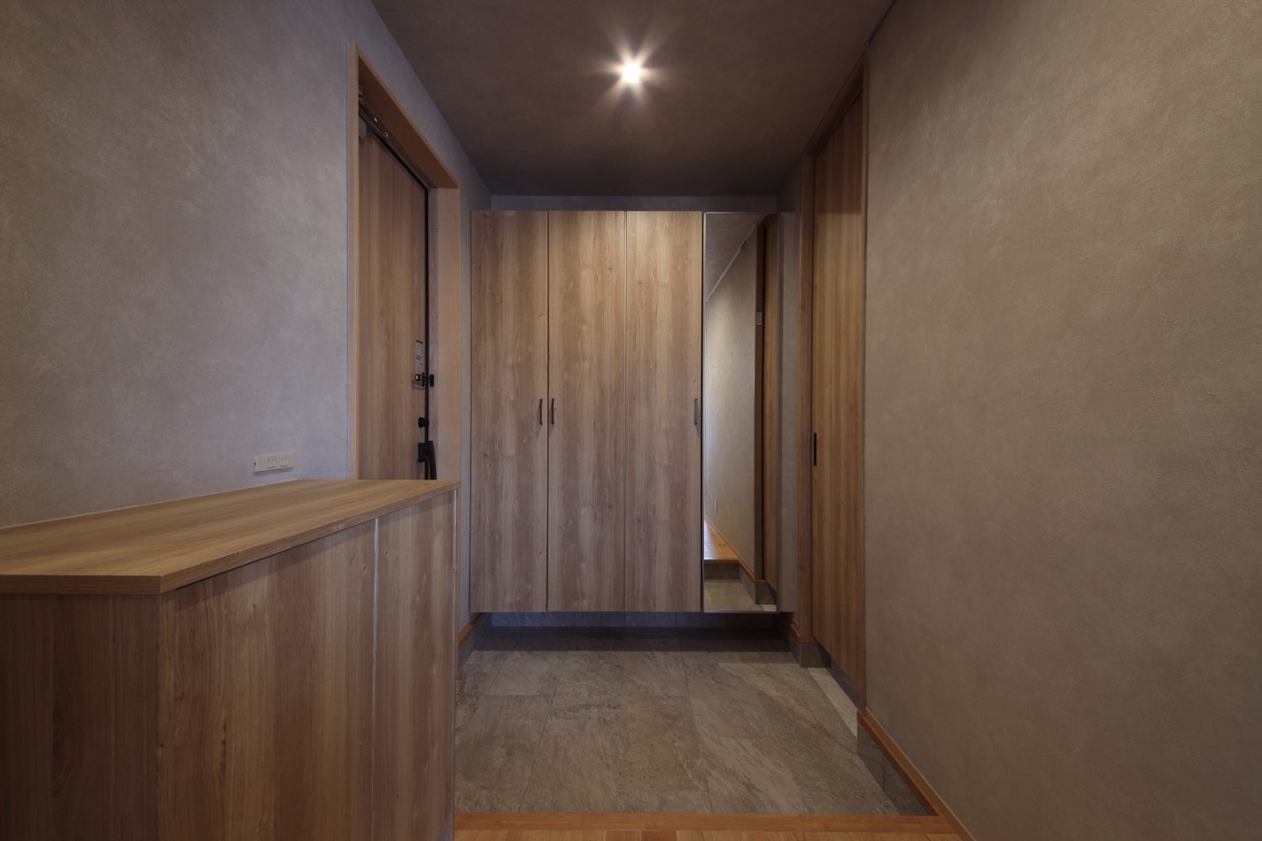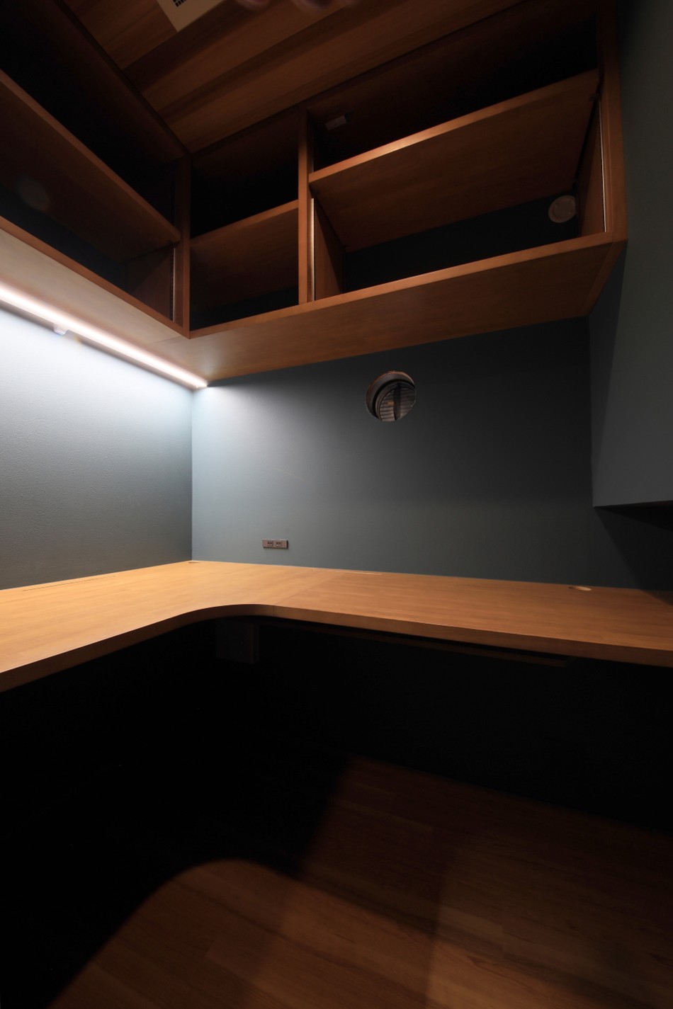 渋めのクロスに各種木目調の部材が落ち着いた雰囲気にマッチしています。