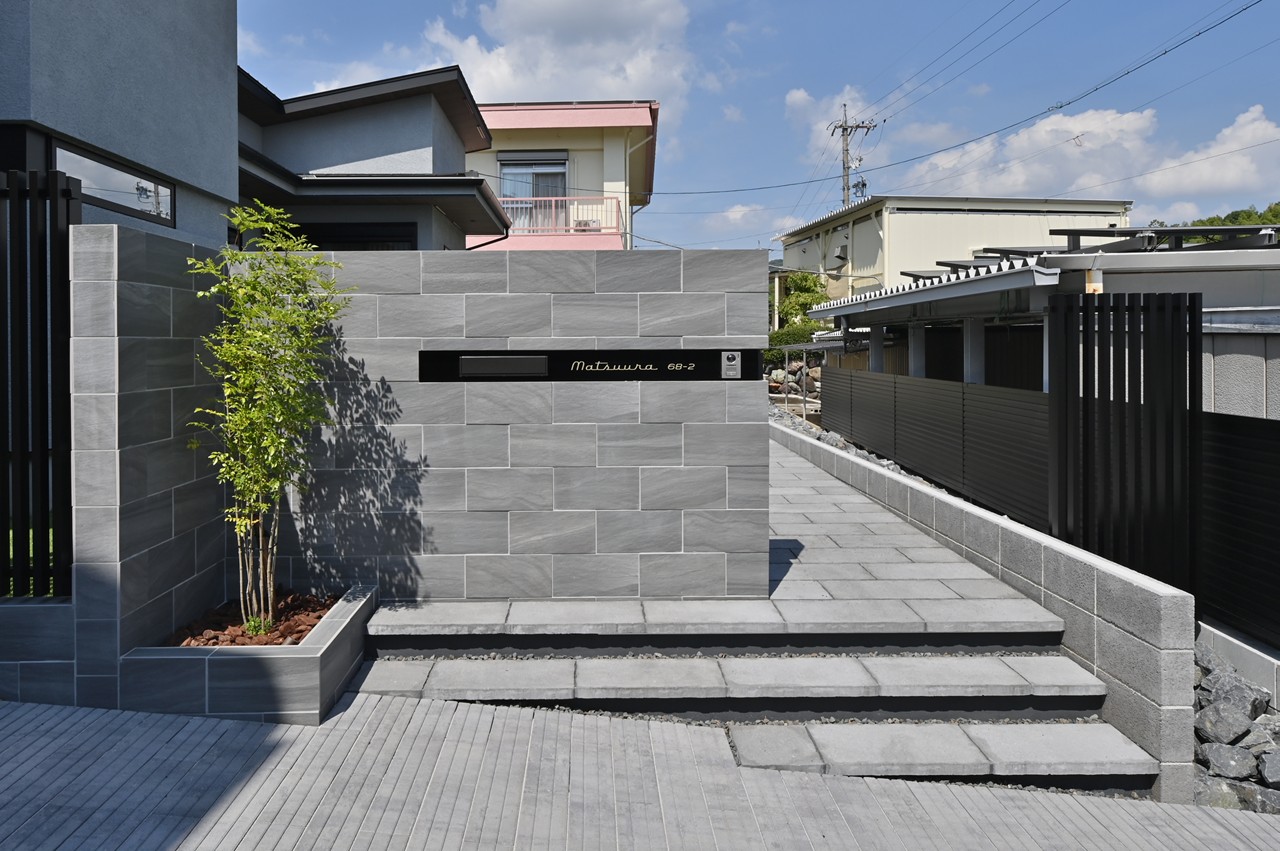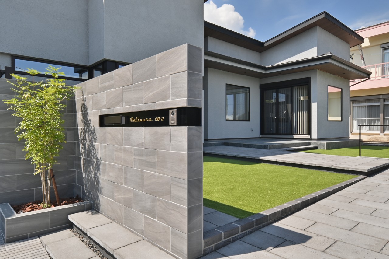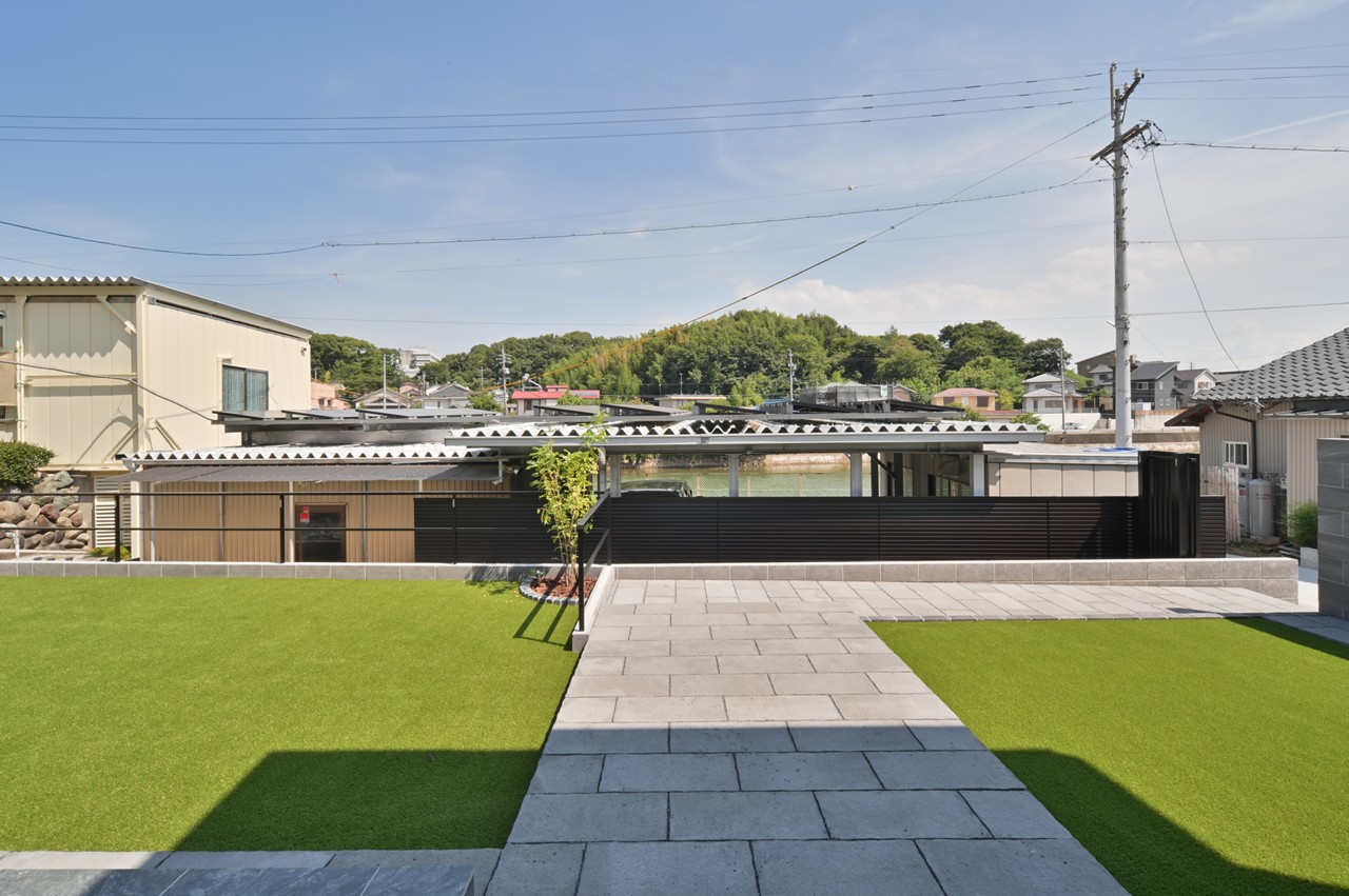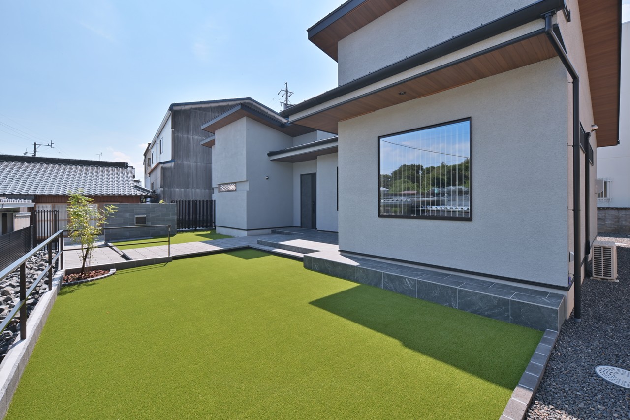 そのアプローチからのガーデン、テラスは緑とタイルの一体感があり、家族の楽しみを倍増させてくれますね。