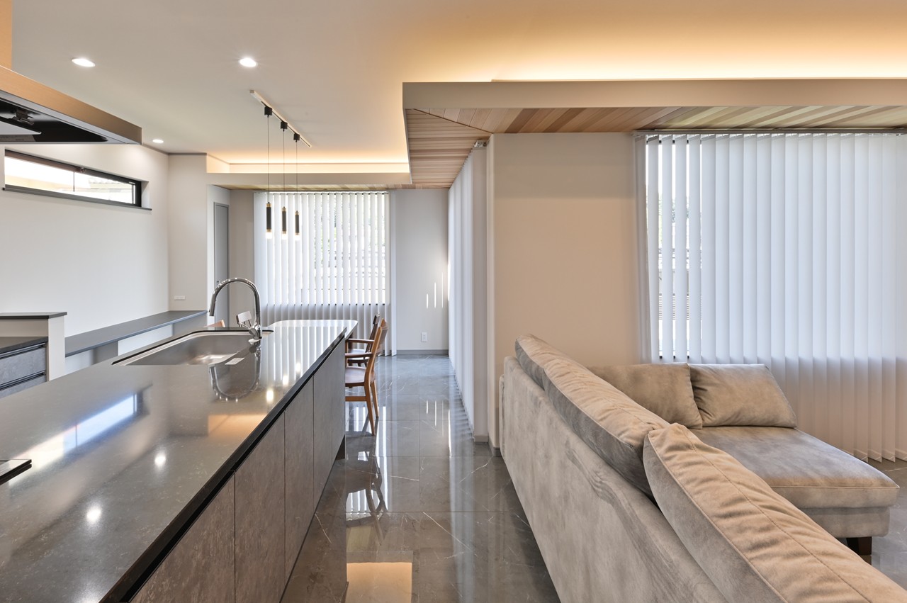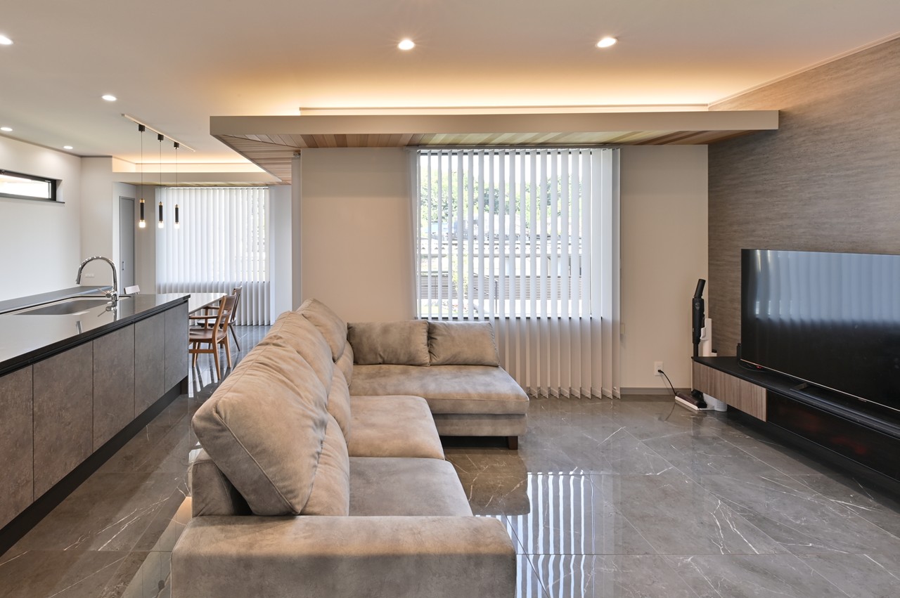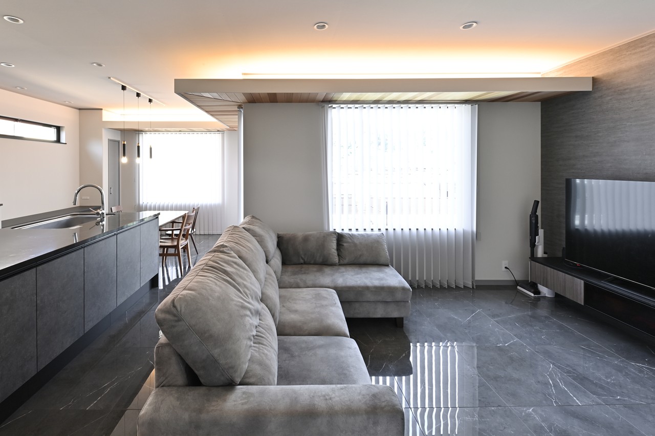 光沢のある床タイル、間接照明の使い方でリビングの雰囲気もガラリと変わります。