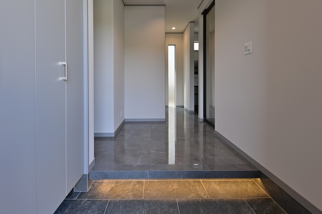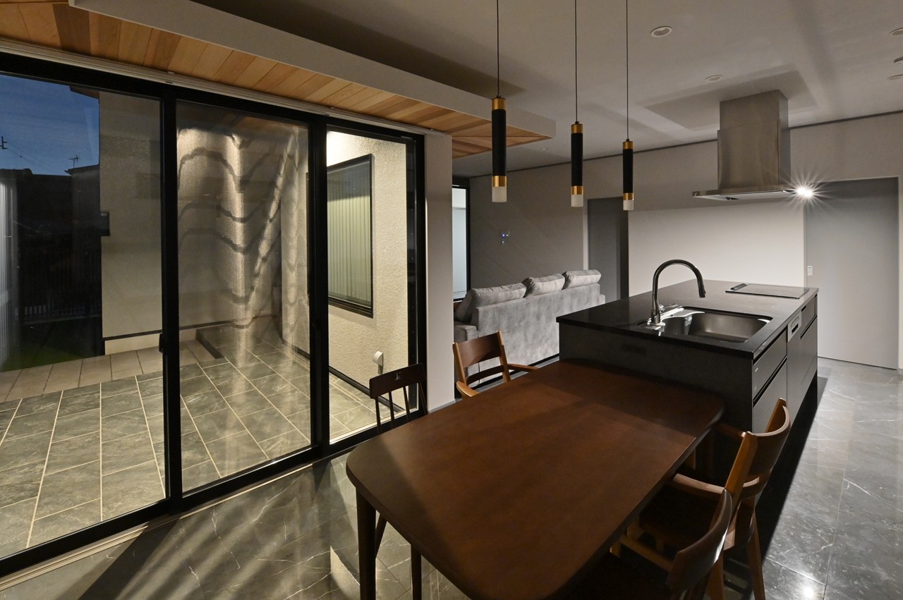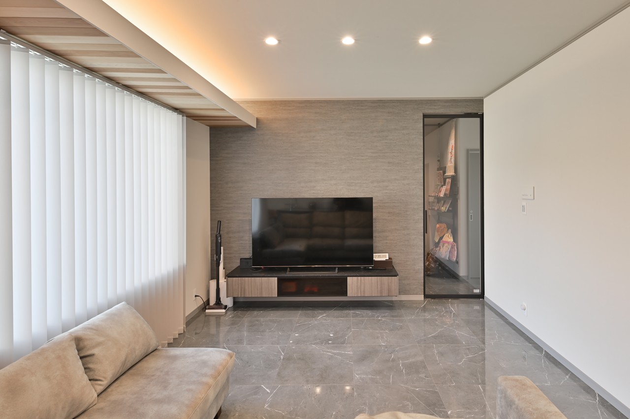 光沢のある床タイル、間接照明の使い方でリビングの雰囲気もガラリと変わります。