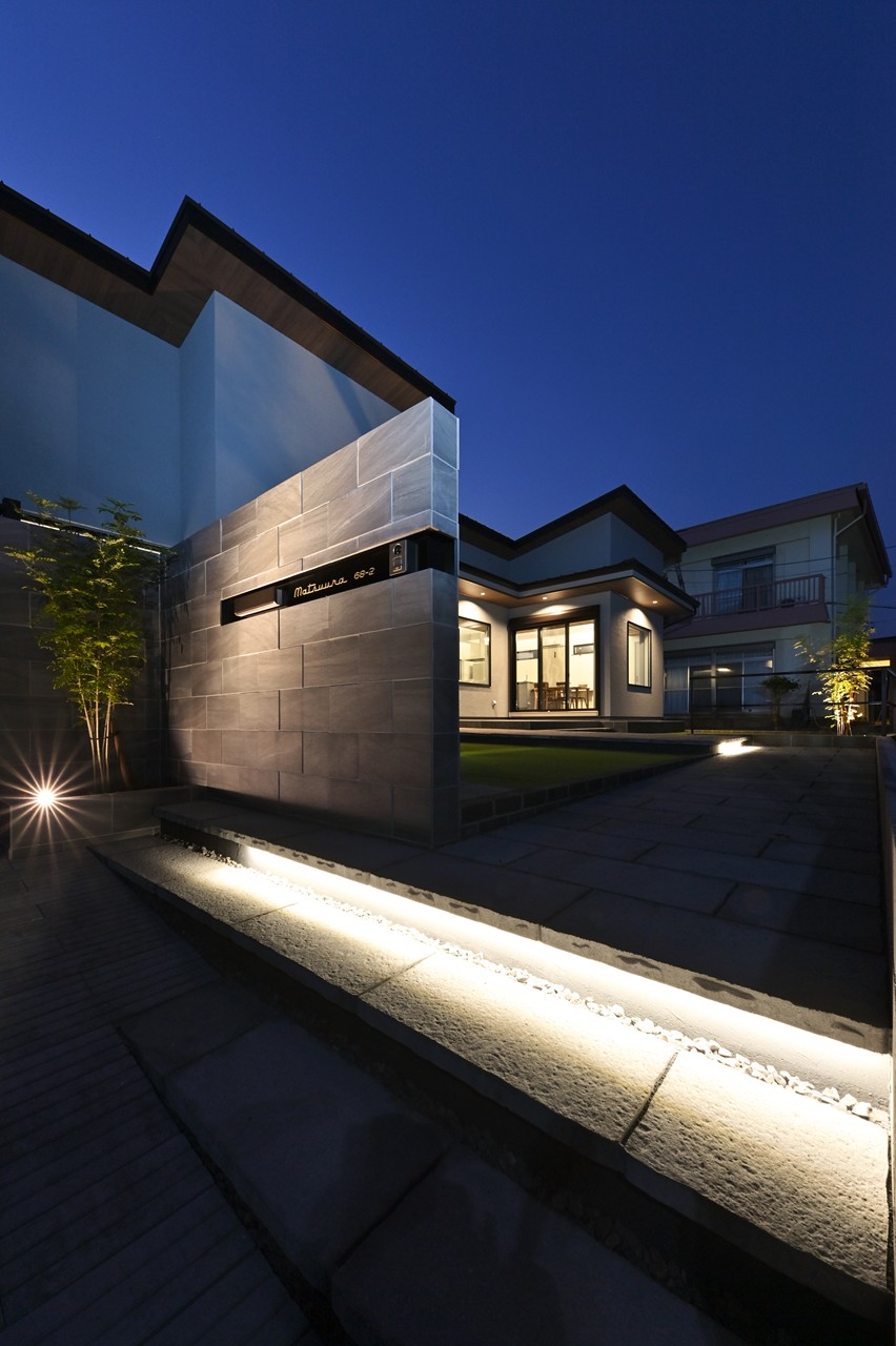 クールなアプローチは夜になると一層ライティングで引き立ちます。
