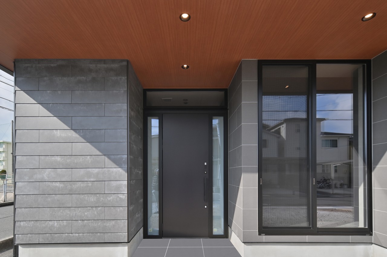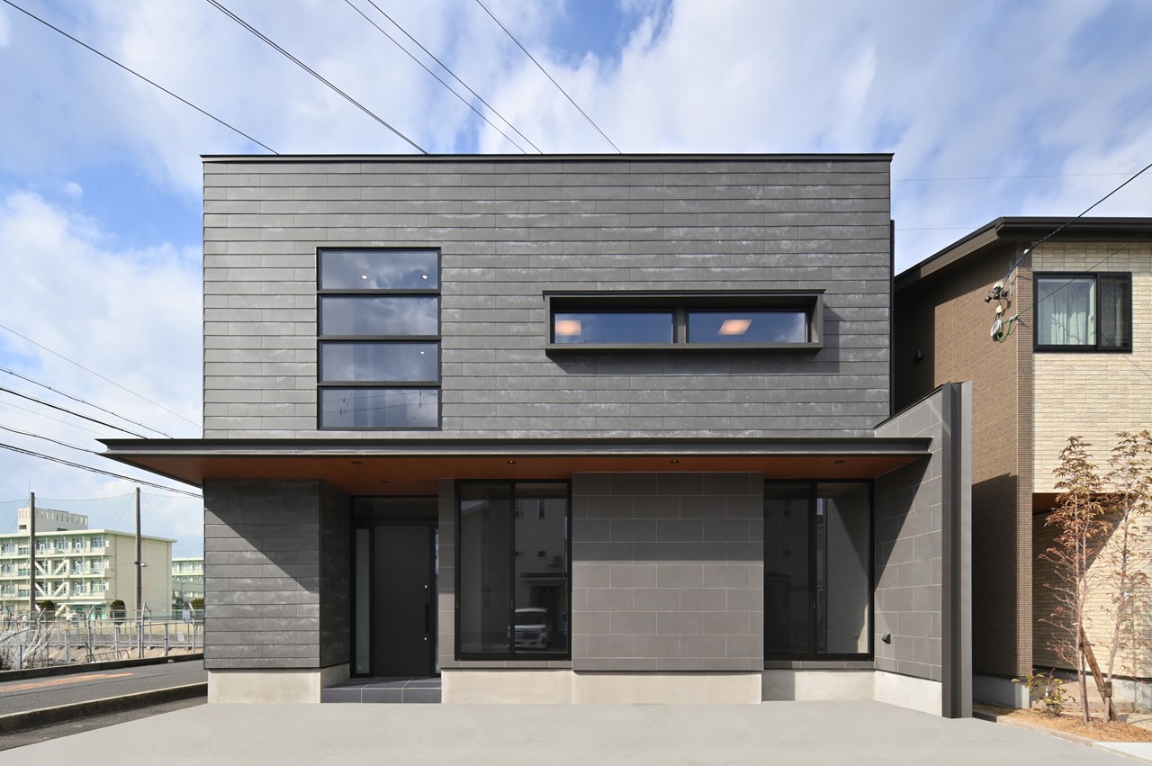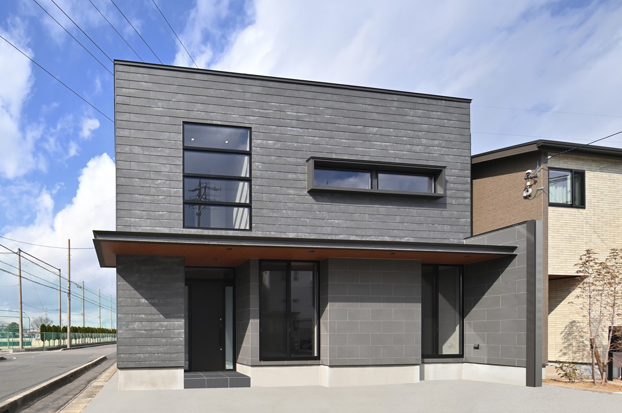 【大きな庇とセメント素材外壁がシックな外観を形成】