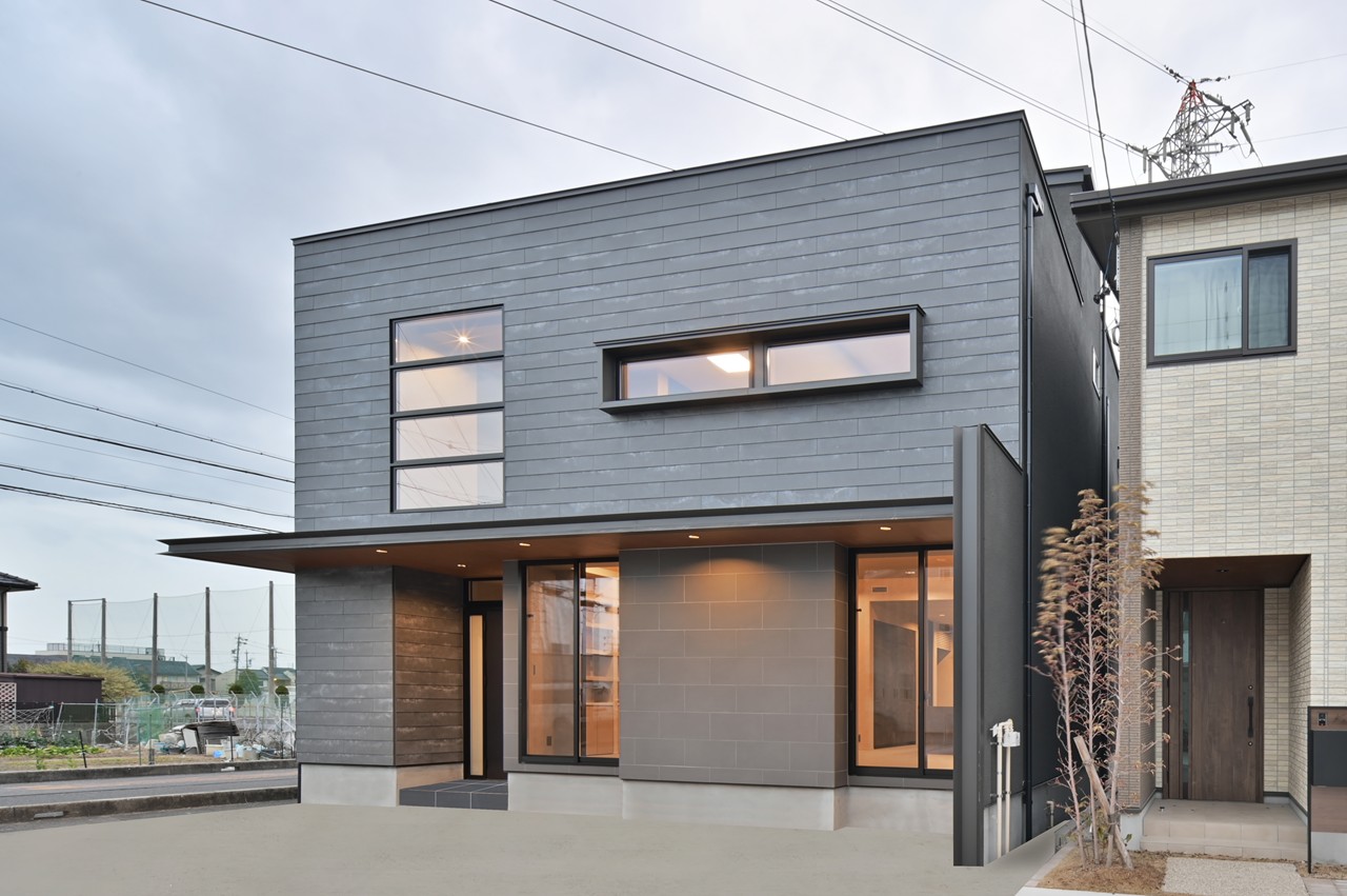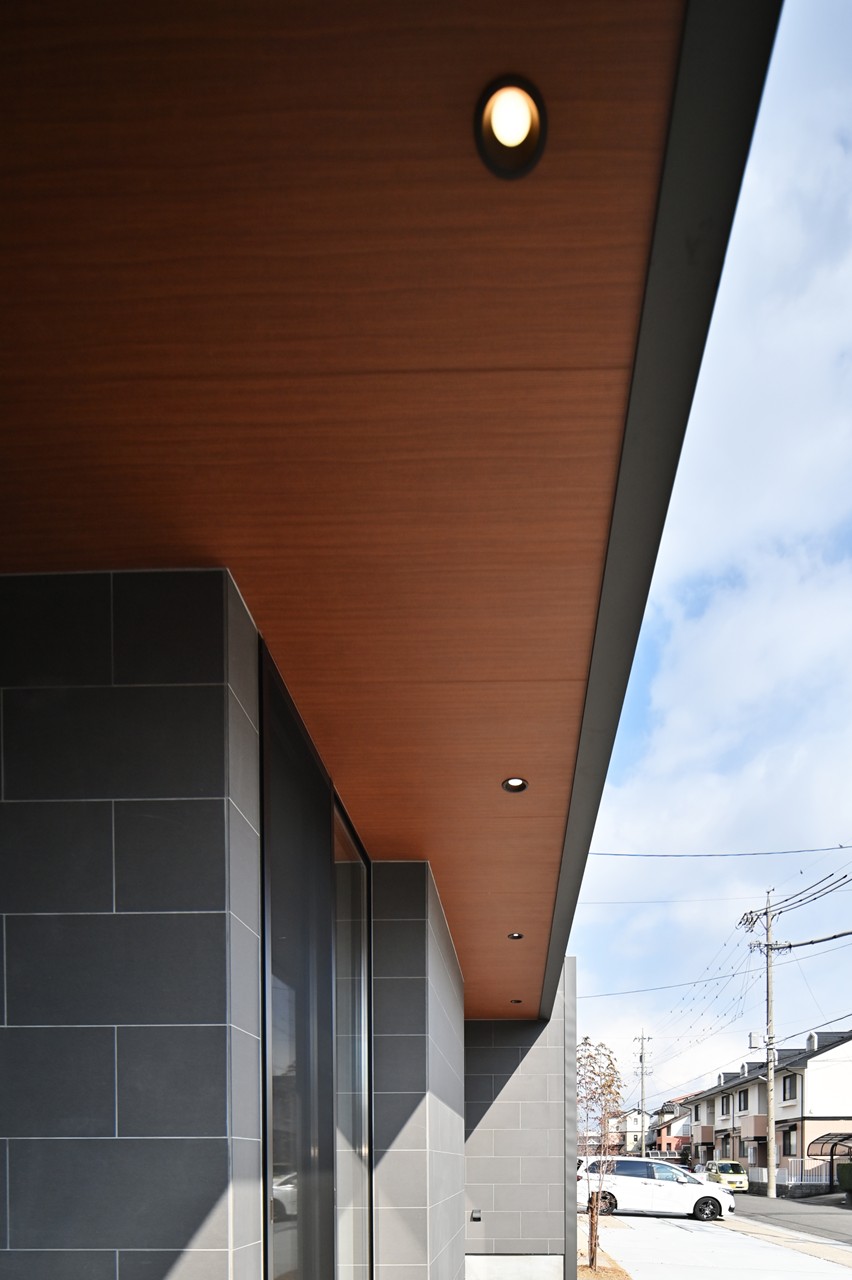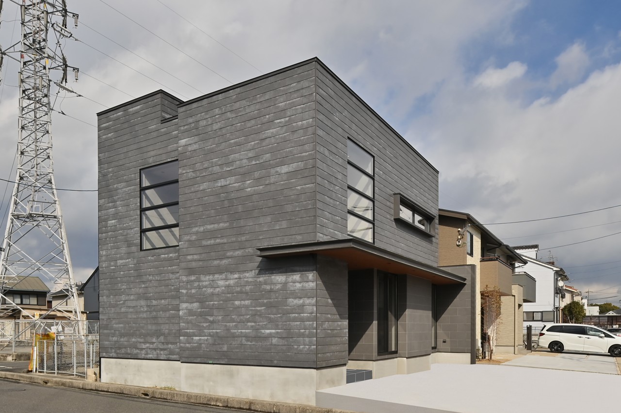 【大きな庇とセメント素材外壁がシックな外観を形成】