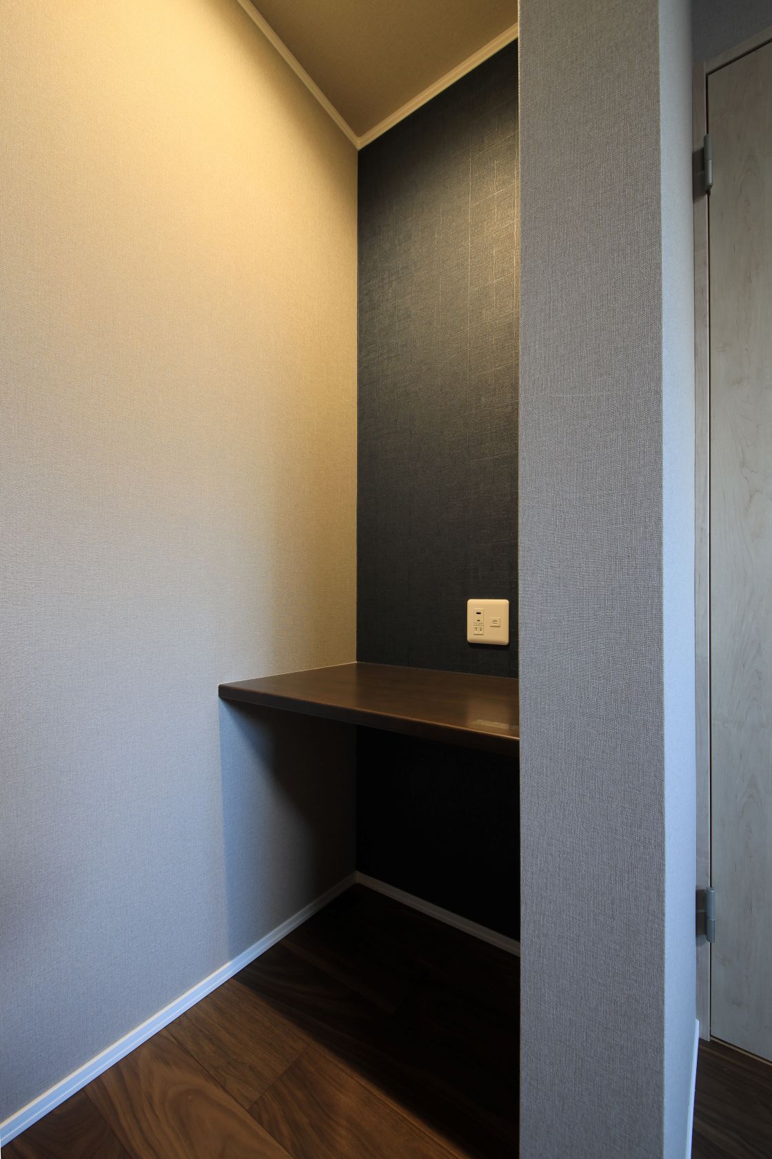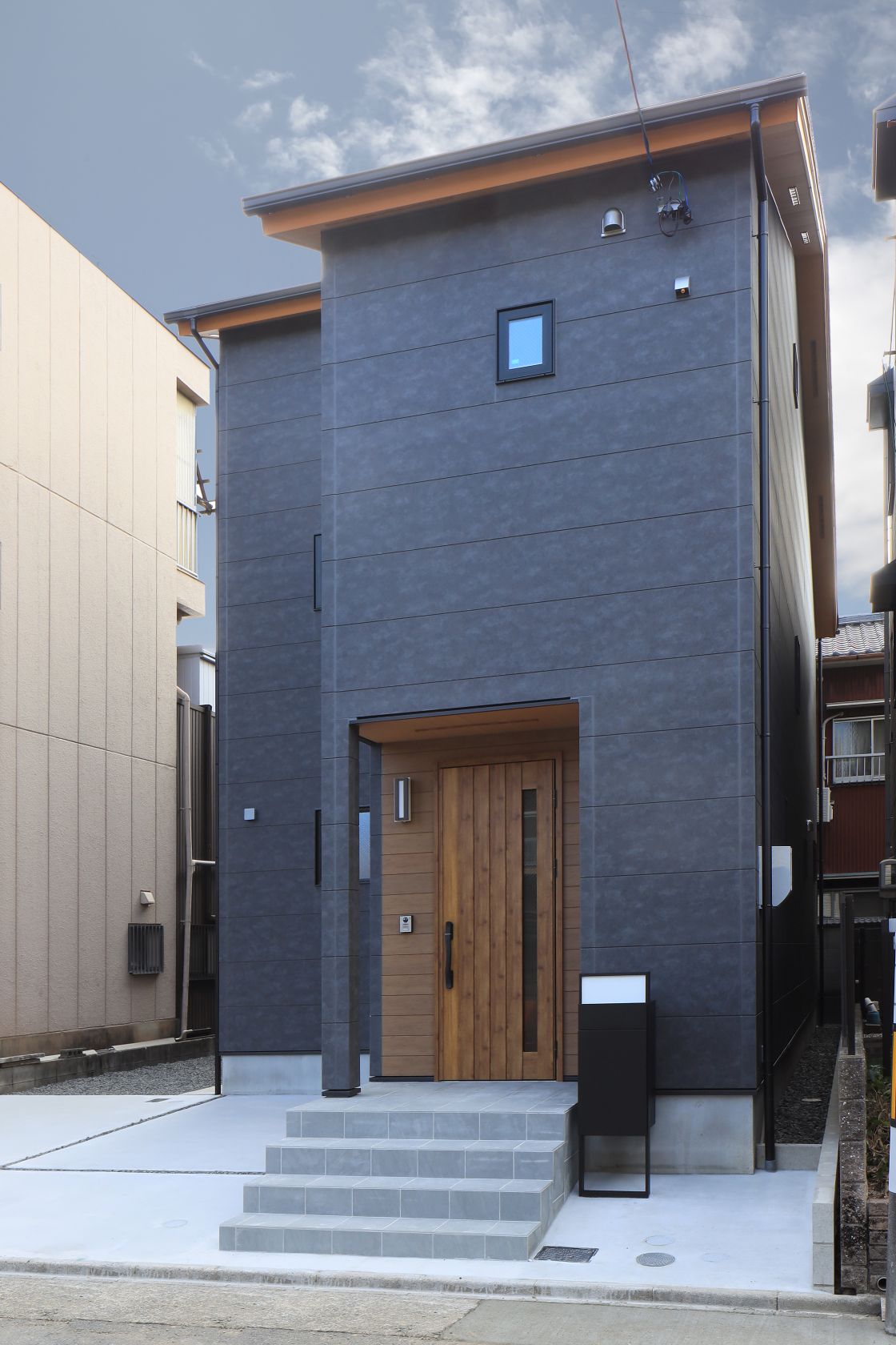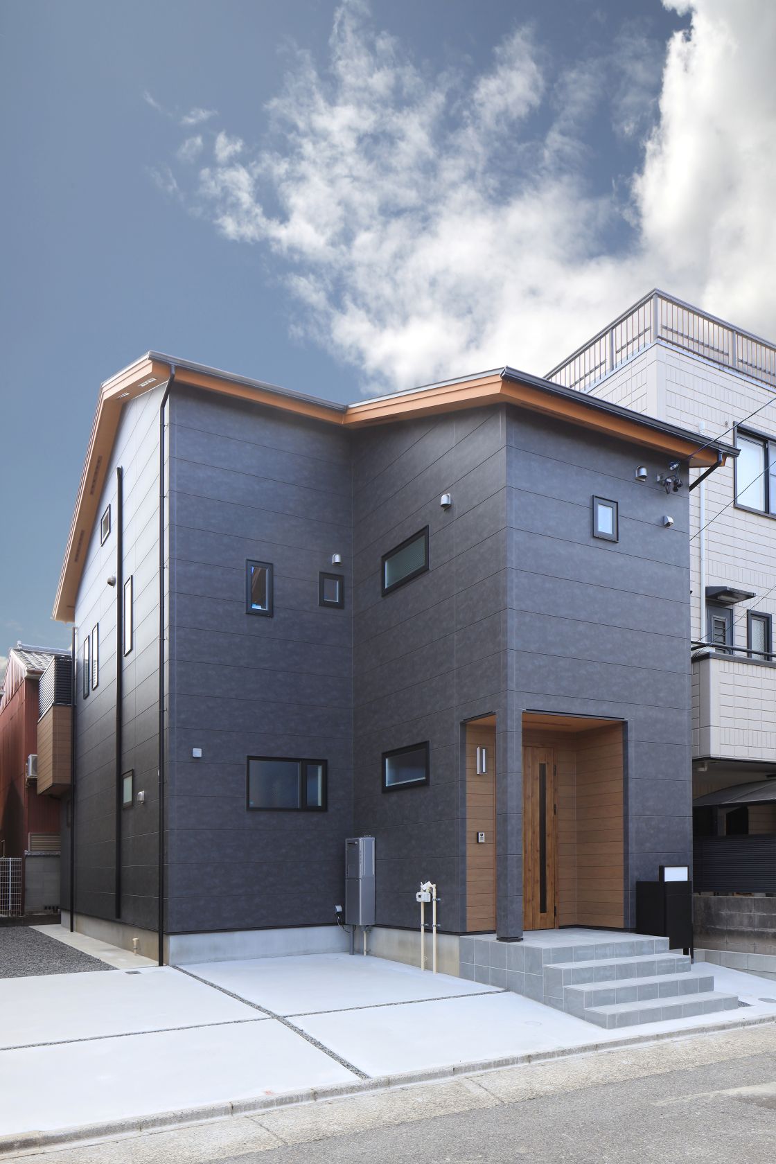ブラックと木目調サイディング、そして木目調ドアのアンサンブルが