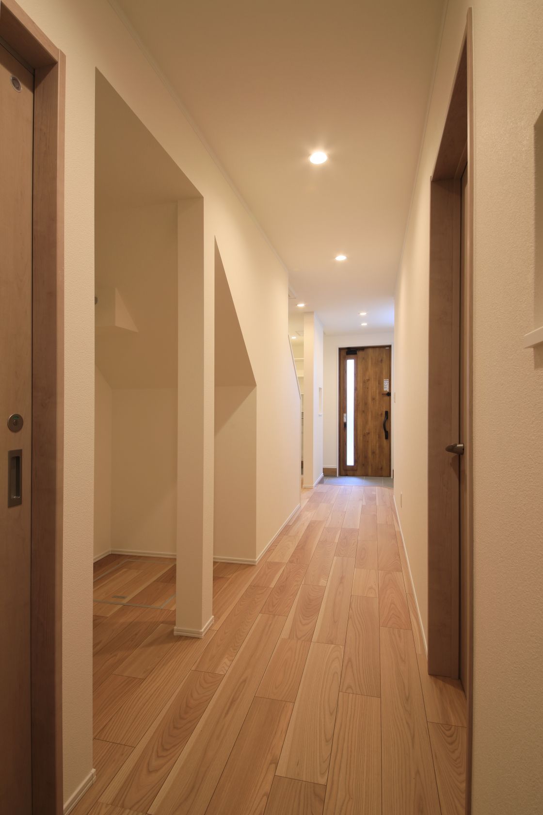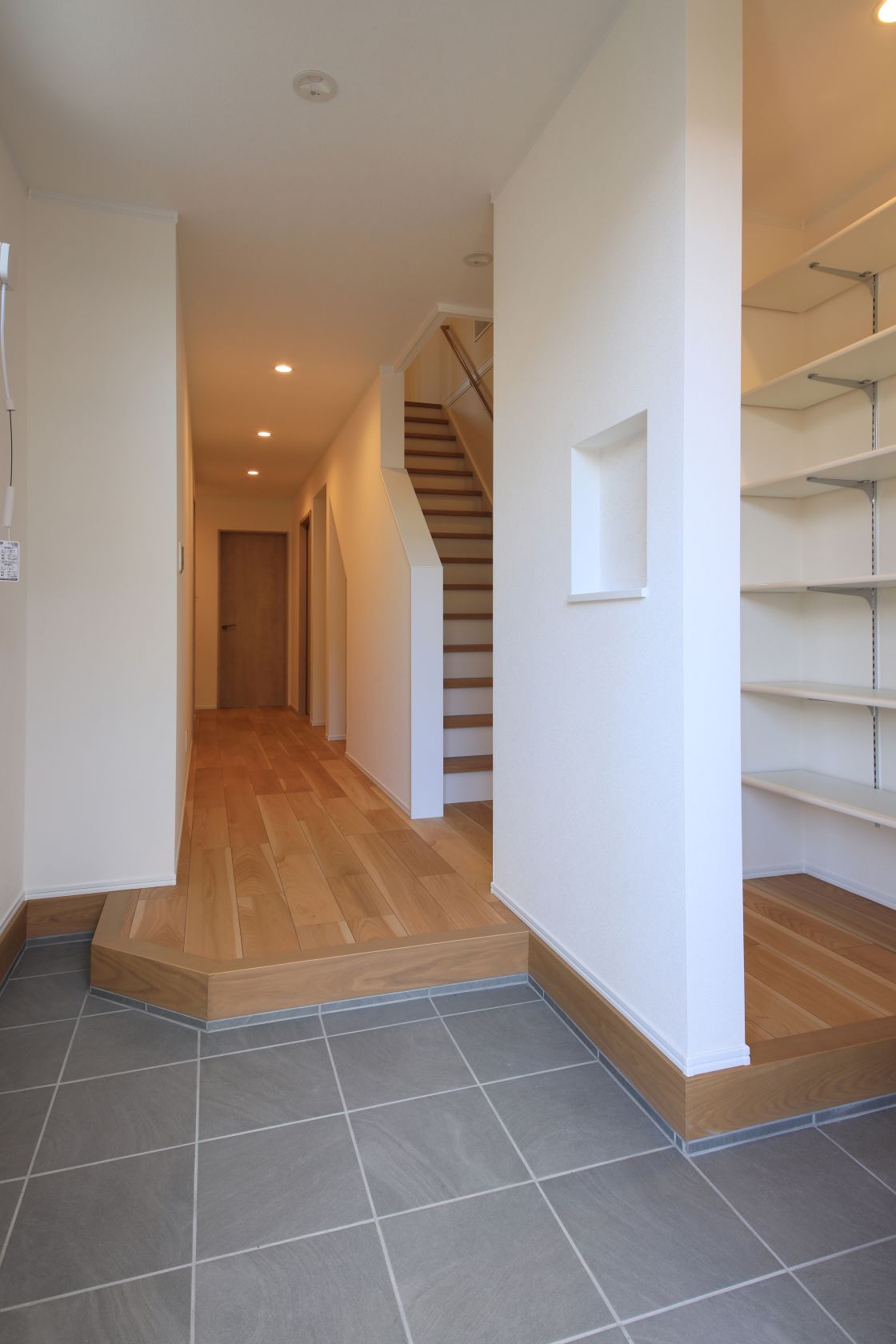 広々とした玄関には玄関収納(靴用)、玄関土間収納を連続して配置しており