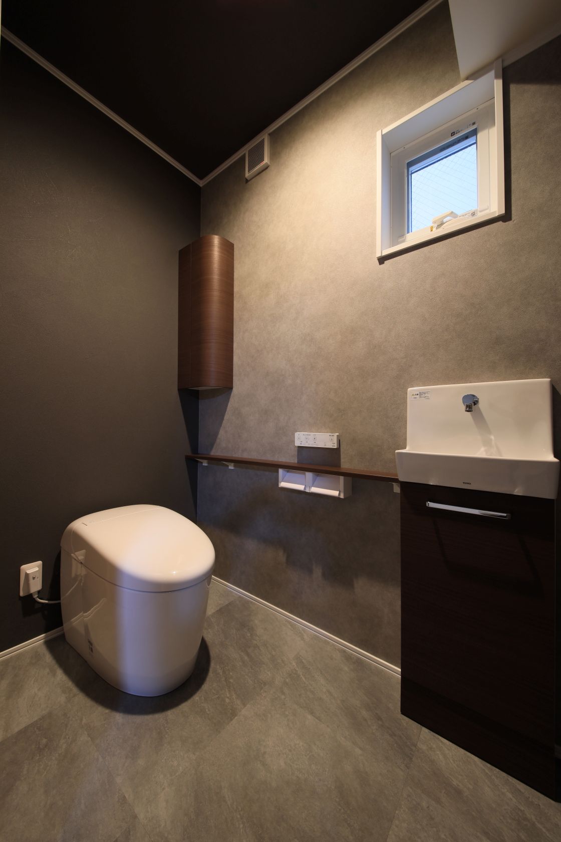シックなトイレ、洗面化粧台には収納多数、快適なユニットバスは